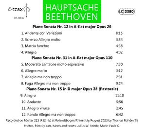 Die neongrüne CD enthält die As-Dur Sonate Opus 26, die As-Dur Sonate Opus 110 sowie die als „Pastorale“ bekannte D-Dur Sonate Opus 28.