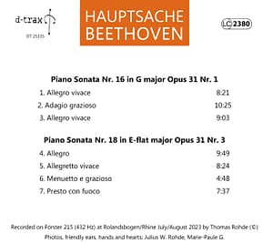 Die orange-braune CD enthält die beiden Sonate G-Dur Opus 31 Nr.1 und Es-Dur Opus 31 Nr.3 (mit dem berühmten Motiv „Liebst Du mich?“).