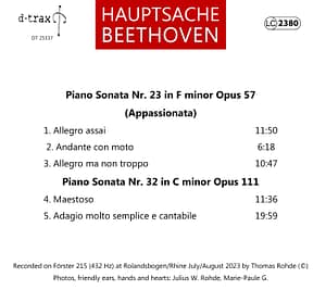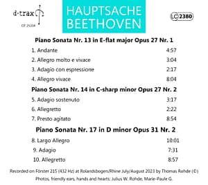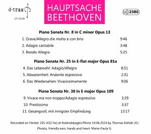 Seit Juli 2024 sind vier „Hauptsache Beethoven“ CDs erhältlich, am 15.09.2024 folgte die fünfte, pinkfarbene CD mit „Pathétique“, „Les Adieux“ und Opus 109.